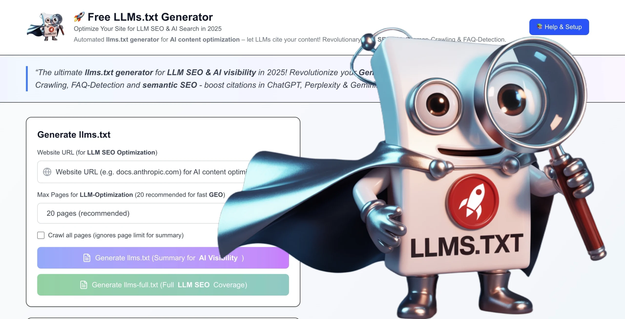 🚀 Take control of AI crawlers - in minutes, error-free. Generate LLMs.txt error-free now - free of charge Benefits at a glance: Error-free creation thanks to integrated validation llms.txt and llms-full.txt in one go 100% free of charge, immediately...
