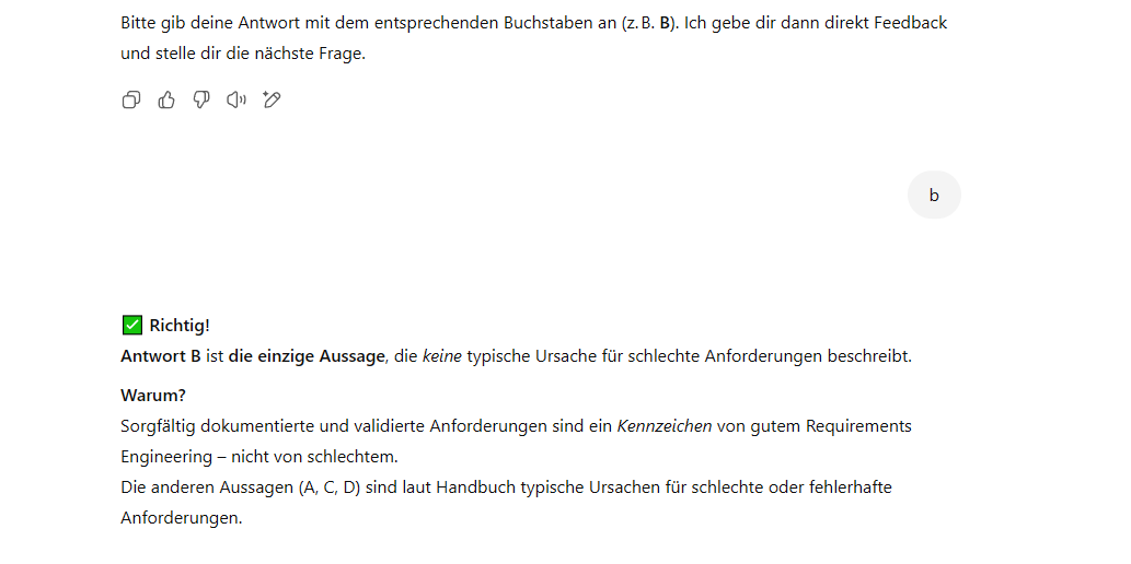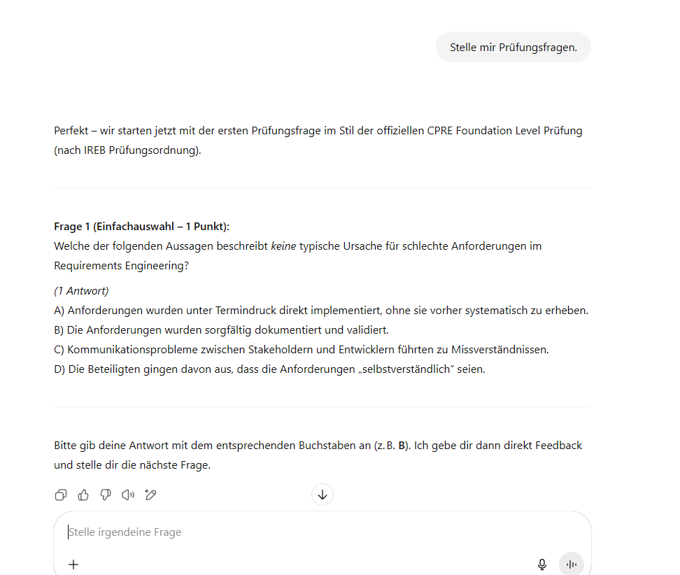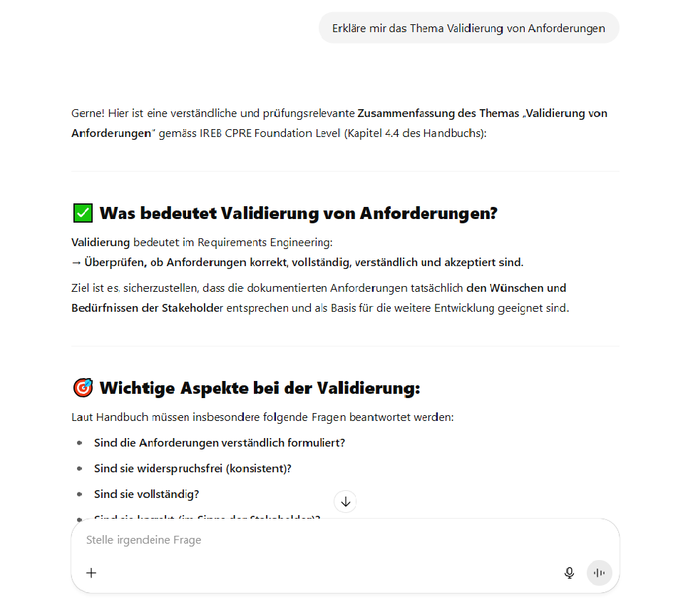Exclusively for course participants: Our AI-supported learning tool helps you to prepare specifically for the IREB Certified Professional for Requirements Engineering exam after the training.