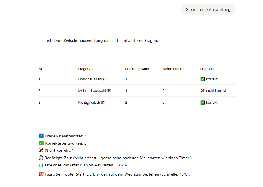 - Learning status & evaluation: Keep an eye on your progress: See at a glance where you stand and where you can still improve.
